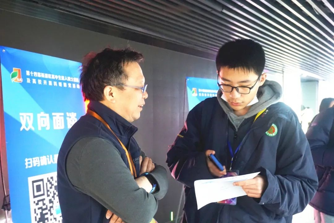 双向面谈是“双进入”活动一大特色,参与活动的每位高中生均可结合课题设计和兴趣志向等方面,自主选择与最多4个培育基地的导师依次进行交流互动,给同学们提供了一次展示科学表达能力和逻辑思维水平的机会。