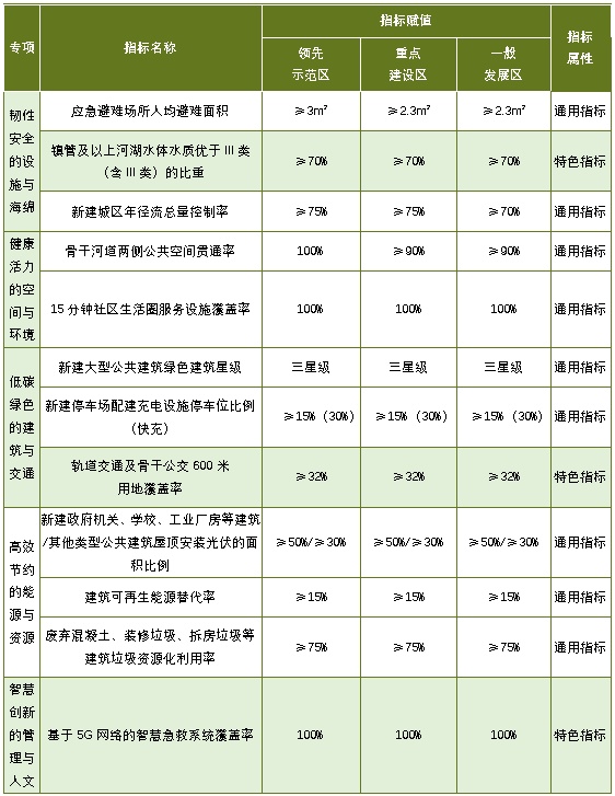 《松江新城绿色生态规划建设导则》围绕韧性安全的设施与海绵、健康活力的空间与环境、低碳绿色的建筑与交通、高效节约的能源与资源、智慧创新的管理与人文五个维度,构建了通用及特色的20项指标体系。对松江新城领先示范区、重点建设区及一般发展区分区指标赋值,提出多维度绿色低碳要求。