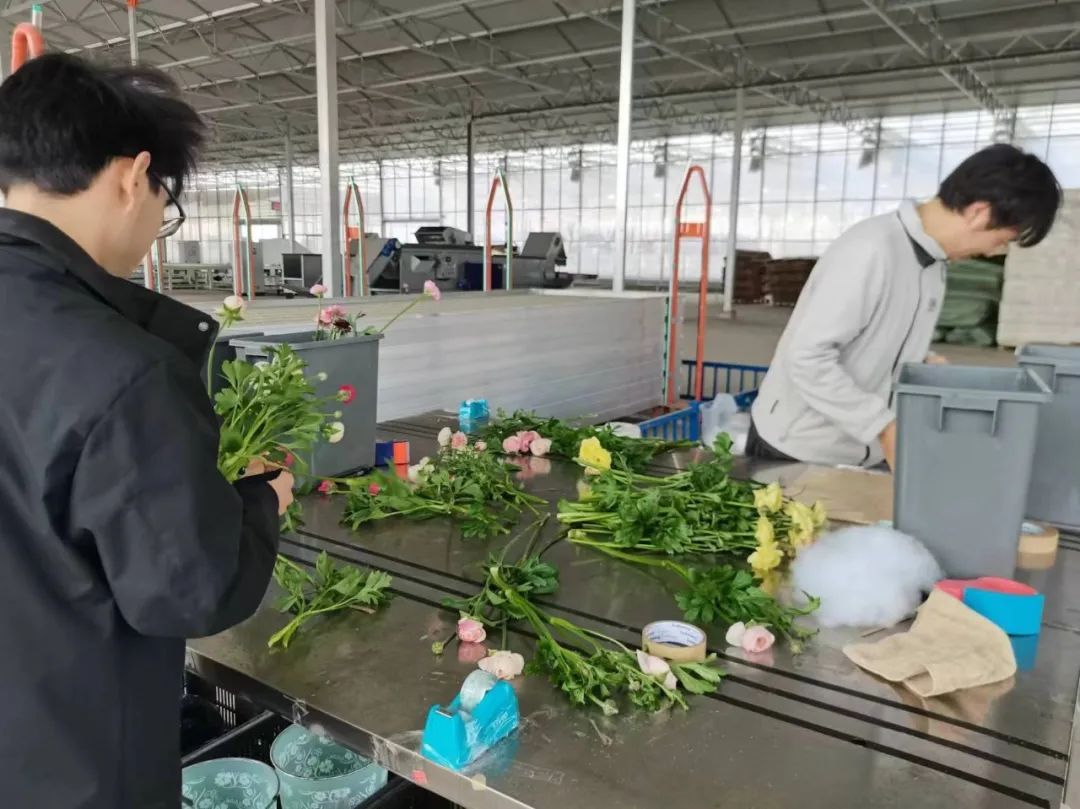 三栋大棚目前由村里出租给农业企业兰桂骐种植鲜花,处于完工后的试运营阶段。兰桂骐在这里试种了地栽花卉五亩,已进入花卉采收期。走进这片初春的花田,红色、粉色、紫色、白色的花朵为进口银莲花,来自意大利和以色列,有的含苞待放,有的花开正艳,有的正打骨朵,工人们将这里出产的花卉加工后做成手捧的鲜切花,供应上海乃至长三角市场。