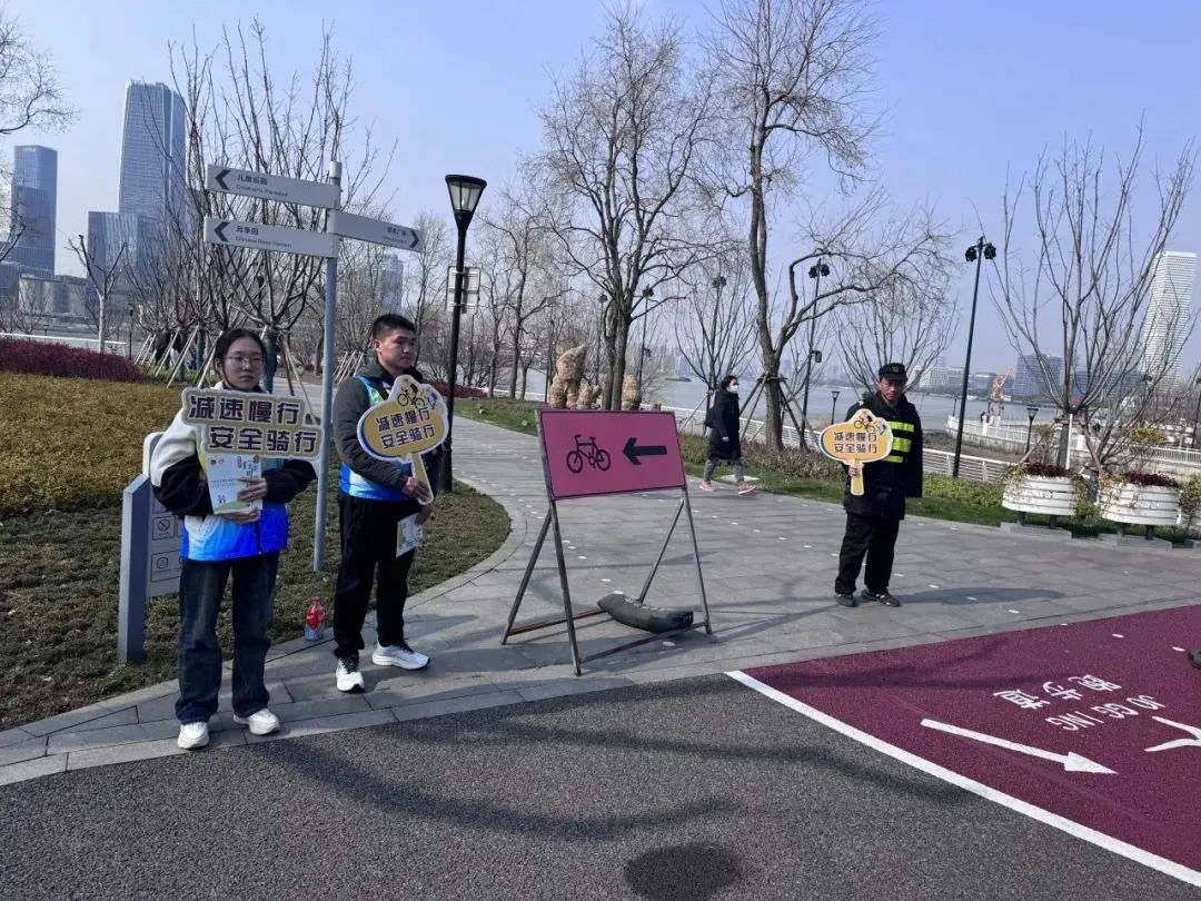 宣传活动在歇浦路渡口、庆典广场、前滩休闲公园开展,由志愿者手持宣传牌,引导文明骑行、安全骑行,共同呼吁市民游客遵守滨江文明骑行公约,按照“三道”指引地标各行其道,展现传统美德文明礼让,牢记15公里/小时限速慢速骑行,营造一个安全、和谐、友好的休闲空间。