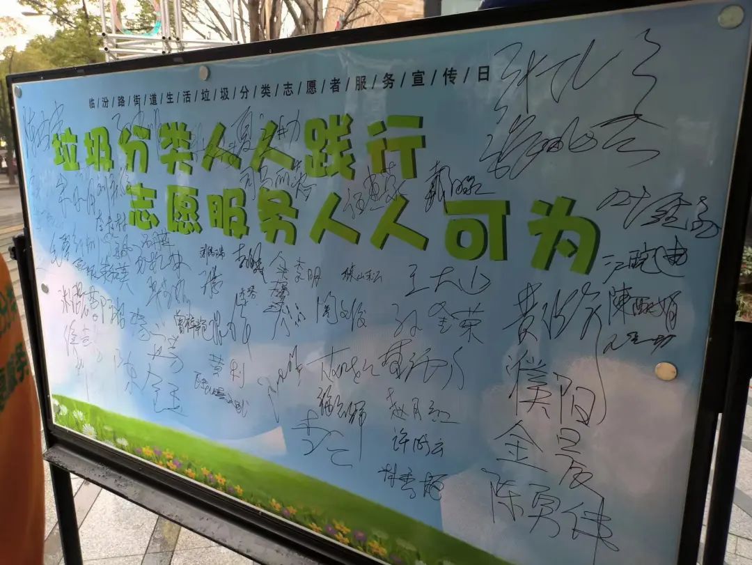仪式结束后,临汾路街道在党群服务中心门口进行集中设摊宣传活动。城运中心精心策划了一系列趣味活动:设置了垃圾分类签名墙,市民朋友们可以通过拍照并分享到朋友圈的方式来参与打卡;举办了垃圾分类知识问答活动,科普垃圾分类知识。