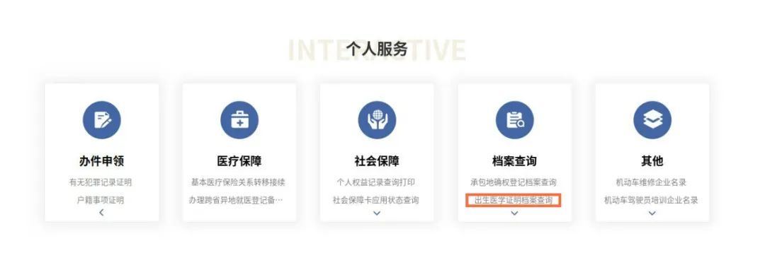 步骤二:下拉至【个人服务】栏,选择“档案查询”板块下“出生医学证明档案查询”事项