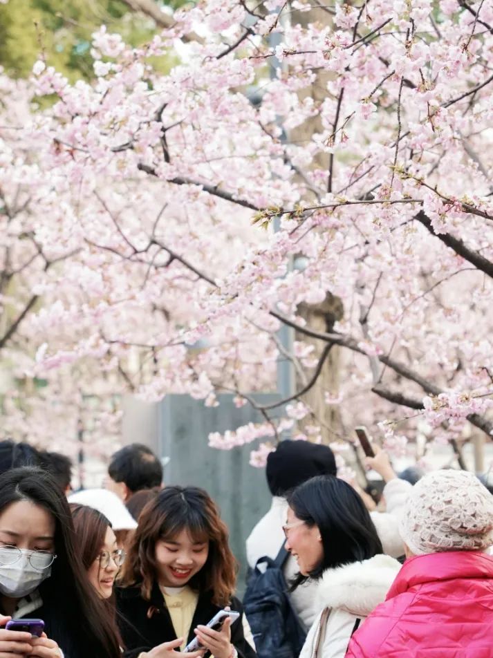 隔着一条马路便远远能望见“春色满园关不住”,成片的樱花盛开灿如云霞。