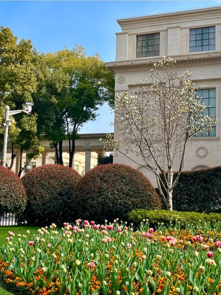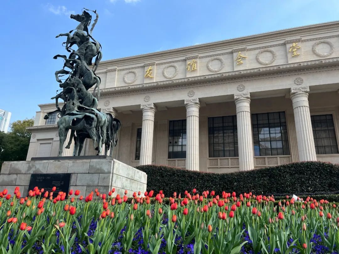 沿着南京西路走一走,路过庄严的友谊会堂,花坛里立着含苞待放的玉兰树,郁金香本就绚丽的色彩在暖阳的沐浴下愈发迷人。