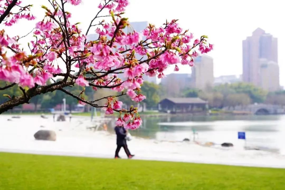 大宁公园白沙滩旁的河津樱已开了有一段时日,远远望去,犹如一片粉红色的云霞,在洁白的沙滩、绿油油的草坪以及波光粼粼的湖水的映衬下,渲染着属于春天的明媚画卷。