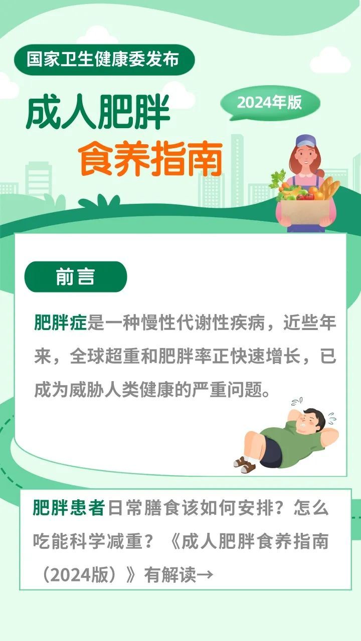 肥胖是一种慢性代谢性疾病,近些年来,全球超重和肥胖率正快速增长,已成为威胁人类健康的严重问题。 肥胖患者日常膳食该如何安排?怎么吃能科学减重?近日,国家卫生健康委发布《成人肥胖食养指南(2024版)》 一起来看看!
