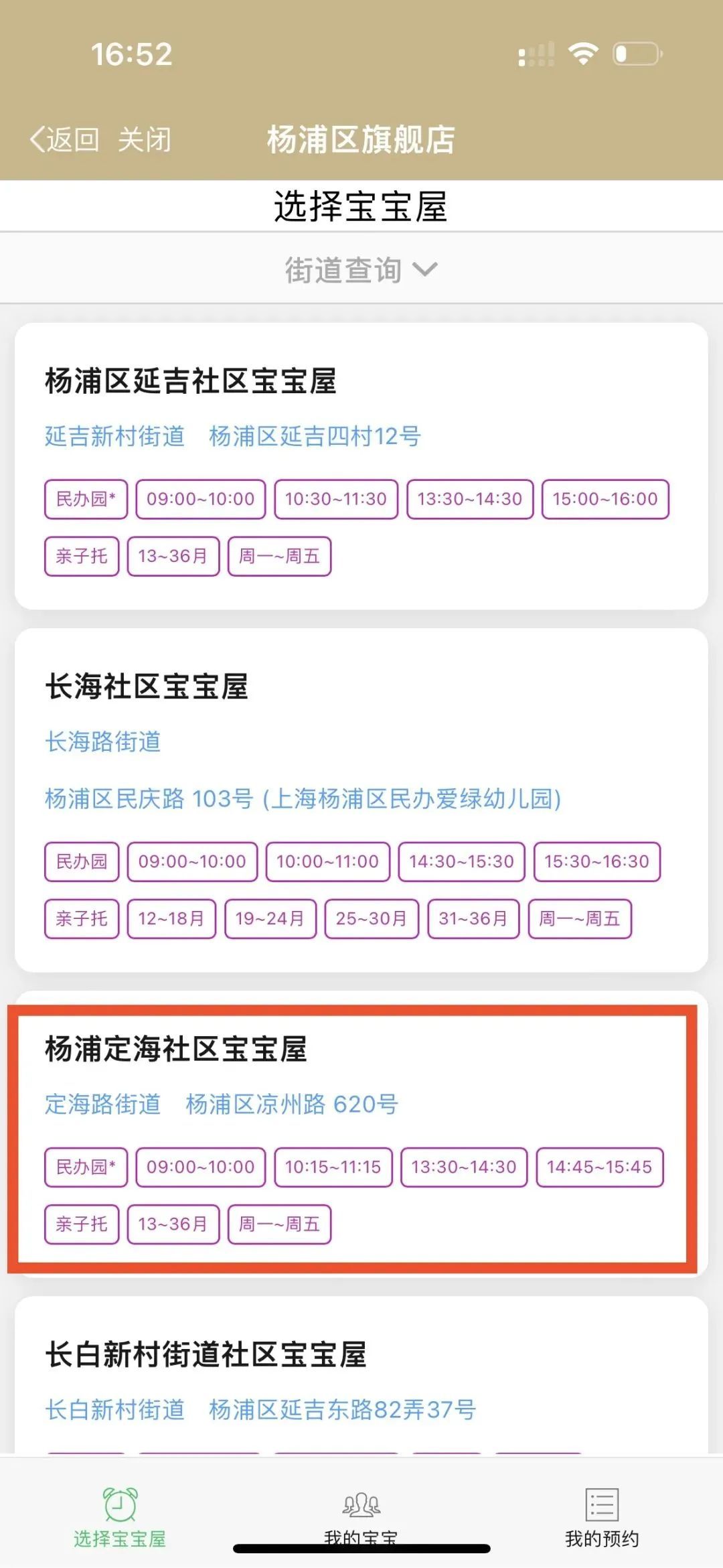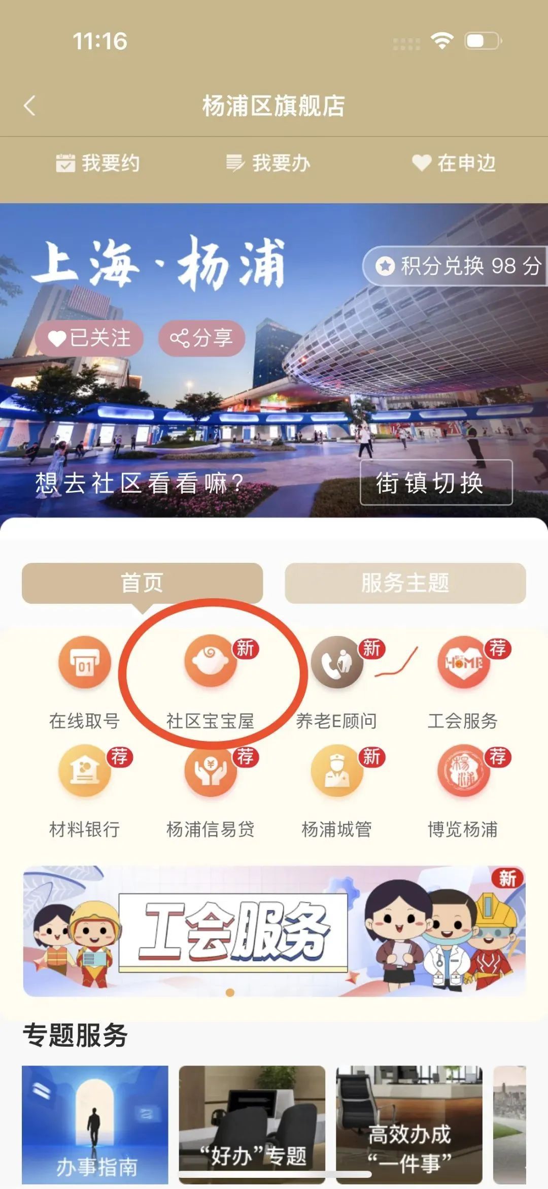 随身办→杨浦旗舰店→社区宝宝屋→下拉至定海路街道宝宝屋进行预约