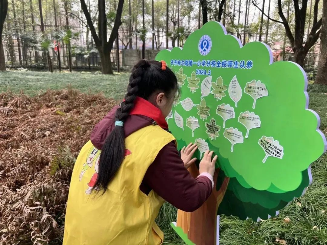 为提高大家的环保意识,为城市护绿增氧共建美好家园,共促绿色生态发展,齐齐哈尔路第一小学分校的师生代表们为认养的古香樟树留下了心愿贴。学生魏莱说:“希望我们能像小树一样茁壮成长,做好接班人。”