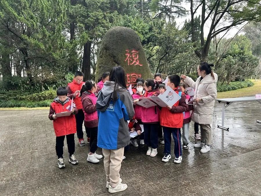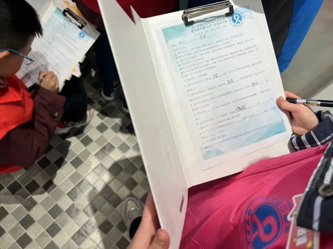 “复兴岛思政小课堂让我受益匪浅,我不仅知道了白庐、认识了香樟树,能看到270度风景的八角亭也让我印象深刻。”三年级学生谢兆泽对岛上的风景和历史知识对答如流。活动中,大家人手一块题板,将所学所感融会贯通,将自己的任务学习单顺利填满。