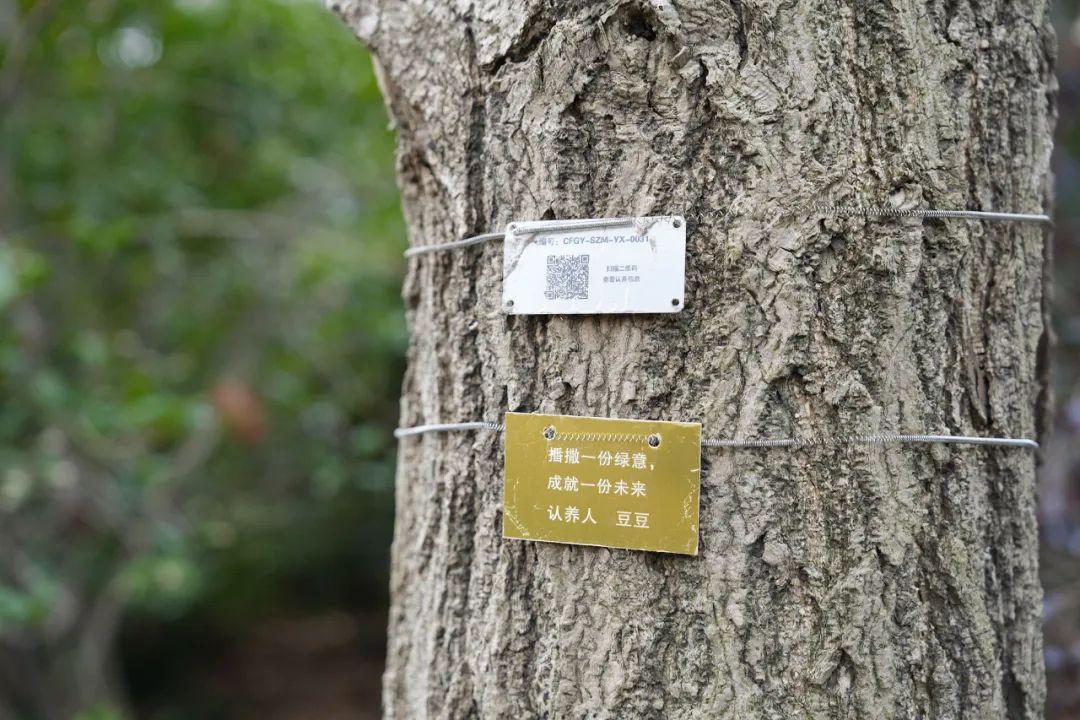 在银杏粗壮的树干上,除了写着编号“CFGY-SZM-YX0031”外,还悬挂着一块金色认领牌,上面印有“播撒一份绿意 成就一份未来”,刘女士表示,她期待和孩子一起通过自己的认养行动,能够带动更多的人关注绿化事业,共同守护我们的美好家园。