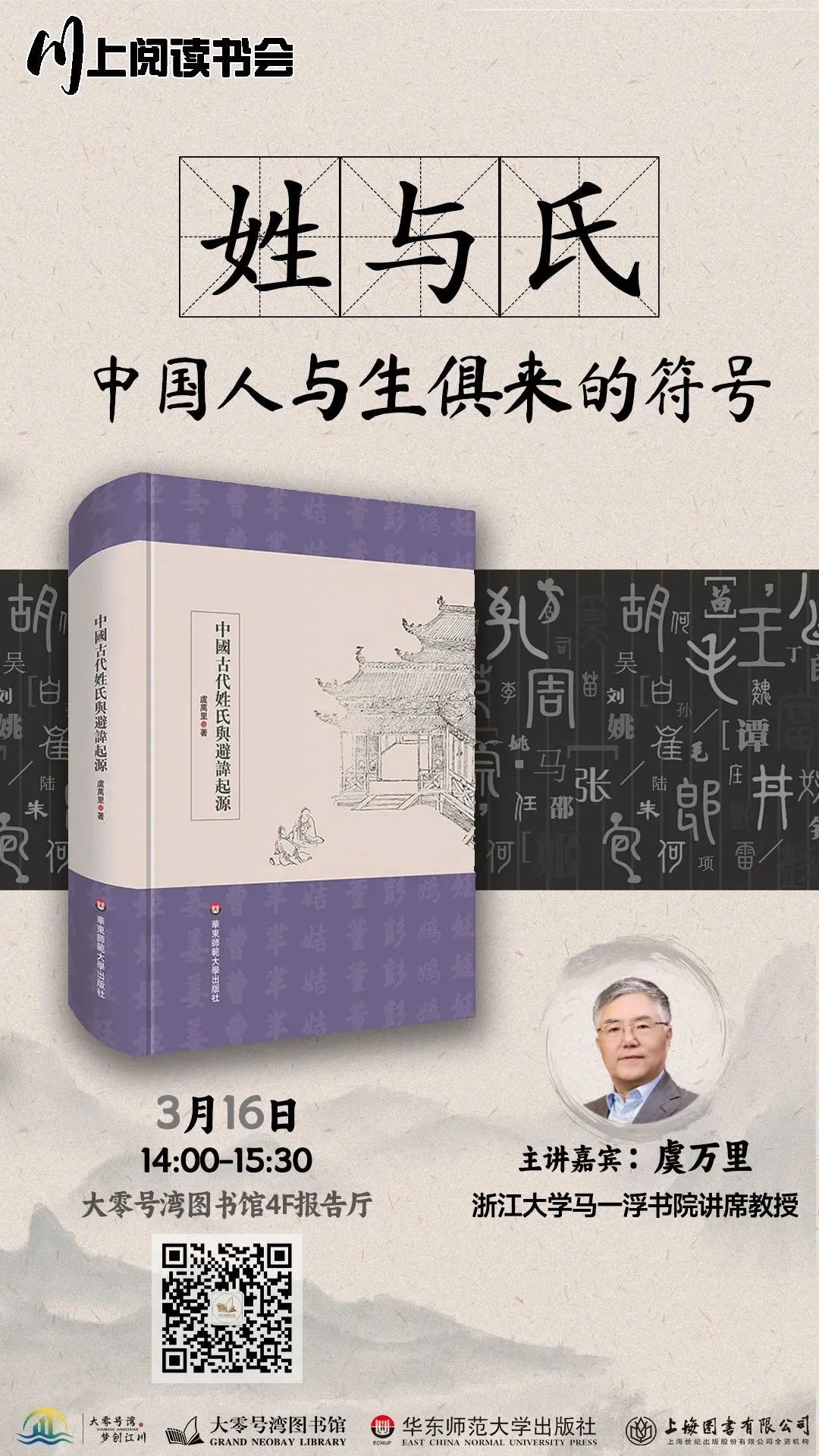 3月16日,浙江大学马一浮书院讲席教授虞万里,将来到大零号湾图书馆,带来“姓与氏——中国人与生俱来的符号”主题讲座。本次讲座,虞万里教授将携其新著《中国古代姓氏与避讳起源》,引用丰富的传世文献和珍贵的出土文物,与读者们分享倾注三十余载心血的研究成果,一窥“姓”与“氏”的渊源、“避讳”背后的奥秘,揭开历史的谜底!