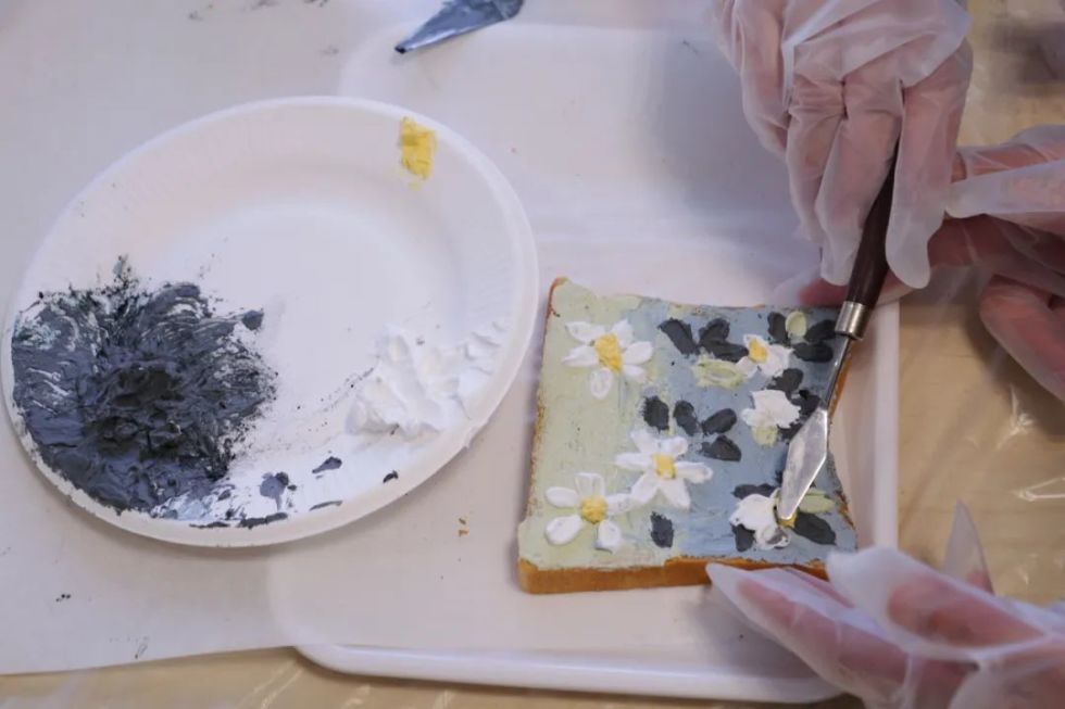 绿色来自于菠菜粉、蓝色来自于蝶豆花粉、黑色来自于竹炭粉、黄色来自于南瓜粉……艺术老师带领学员们用这些可食用材料,与奶油一起搅拌均匀,调制成作画颜料,美术馆里顿时飘香四溢。随后,学员们拿着刮刀,将颜料小心地抹在面包上。颜色深浅、植被疏密、花朵多少,全由自己掌握。完成各自版本的《野玫瑰》后,学员们在拍照留念后,可以把作品带回家,也可以立即享用。