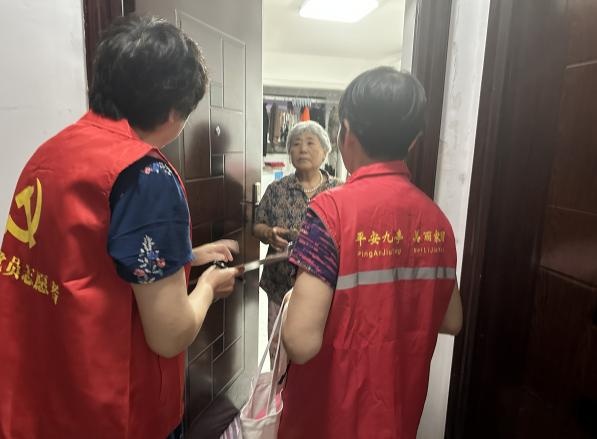 “阿姨,电动自行车不要停到楼道里,外面有专门的停放点,谢谢配合。”九亭家园第二居民区“管家团”成员在楼道口劝阻着想要推车进来的居民。