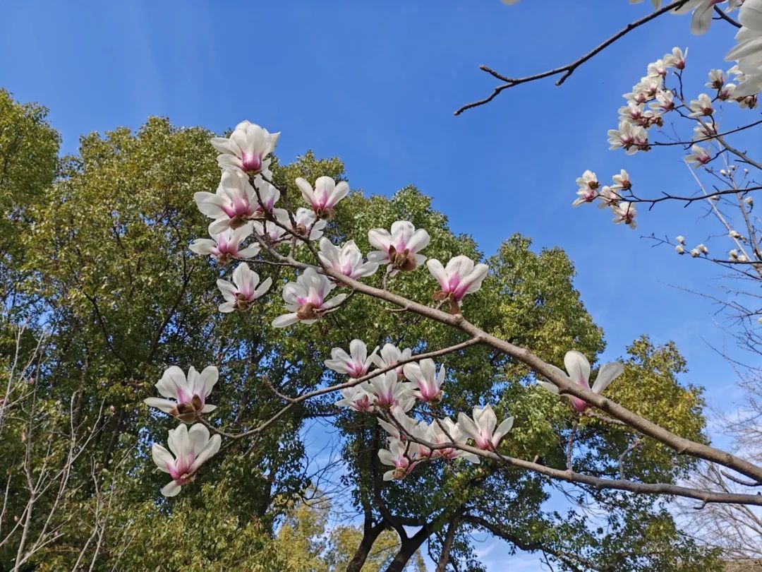 除了玉兰花,绿道附近还有许多多姿多彩的花儿正在展露风姿,吸引游客的目光。同样不被叶片遮挡的朱砂梅颜色鲜艳粉嫩,花朵虽小,却常三五簇拥。金黄的花蕊吐露着缕缕梅香,引得蜜蜂时时伫足。朱砂梅花期较短,随着气温上升,想要一睹芳容的市民朋友们可要抓紧时间啦。