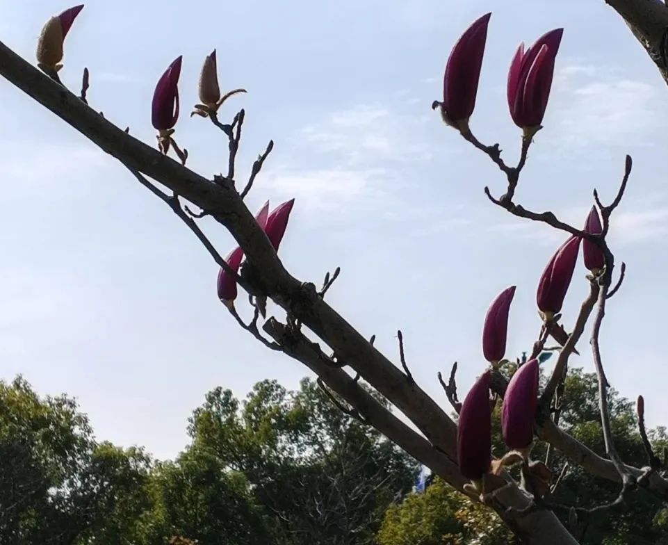 不远处还有一棵含苞待放的紫玉兰树。深紫色的花苞在风中挺立,似乎也在期待盛开的瞬间。据了解,由于今年的气候等因素,紫玉兰的花期较晚,将于不日开放。来此游玩的市民们可以继续期待。