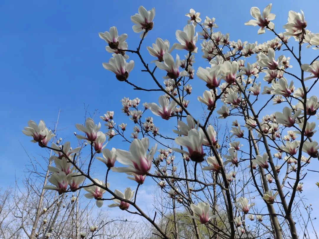 虽然花朵大部分为白色,但是花瓣底部透出的粉紫色则告诉游客,这并不是白玉兰,而是白玉兰与紫玉兰杂交而成的二乔玉兰。二乔玉兰花先叶开放,玉兰花俏立枝头,叶片尚未生长,颇为壮观。