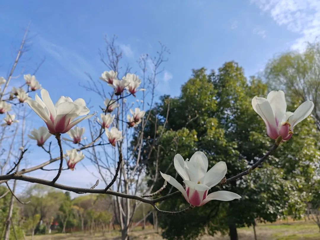 此时正值玉兰花盛放。从空港八路进入长宁外环林带生态绿道,满树盛放的玉兰花格外显眼。白中透粉,粉中带紫,昂立的玉兰为春天增添了绰约的风姿。