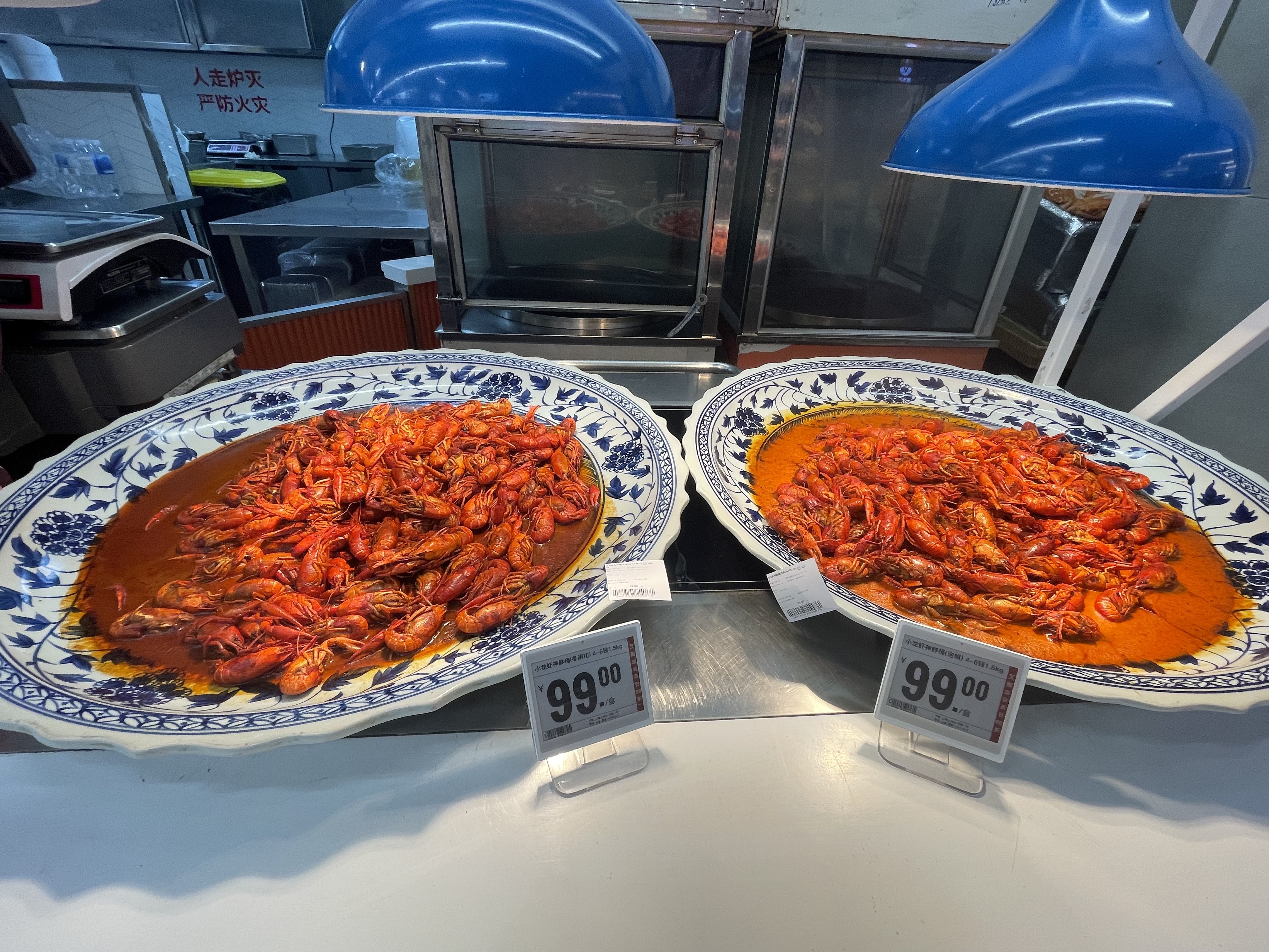 而在熟食区域,则推出了小龙虾神鲜桶,3斤99元,有冬阴功、泡椒、麻辣等多种口味。此外,还有冷藏的小龙虾产品。