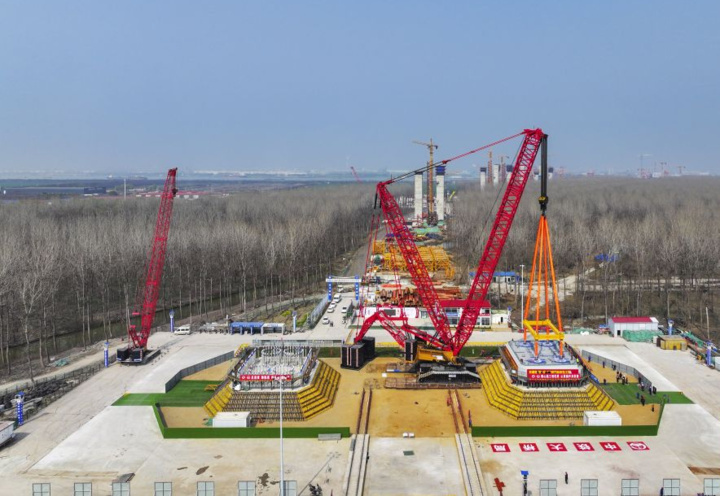 日前,在张靖皋长江大桥南航道桥辅塔施工现场,随着最后一块横梁稳稳落在支架上,大桥辅塔下横梁8个节段全部吊装完成并顺利合龙,为后续上塔柱施工奠定了坚实基础。