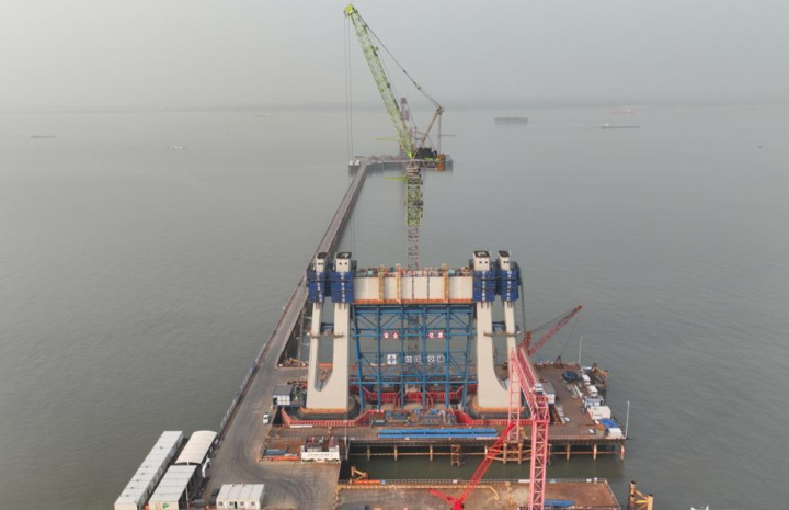 张靖皋长江大桥南航道桥北主塔:塔柱首节段安装完成