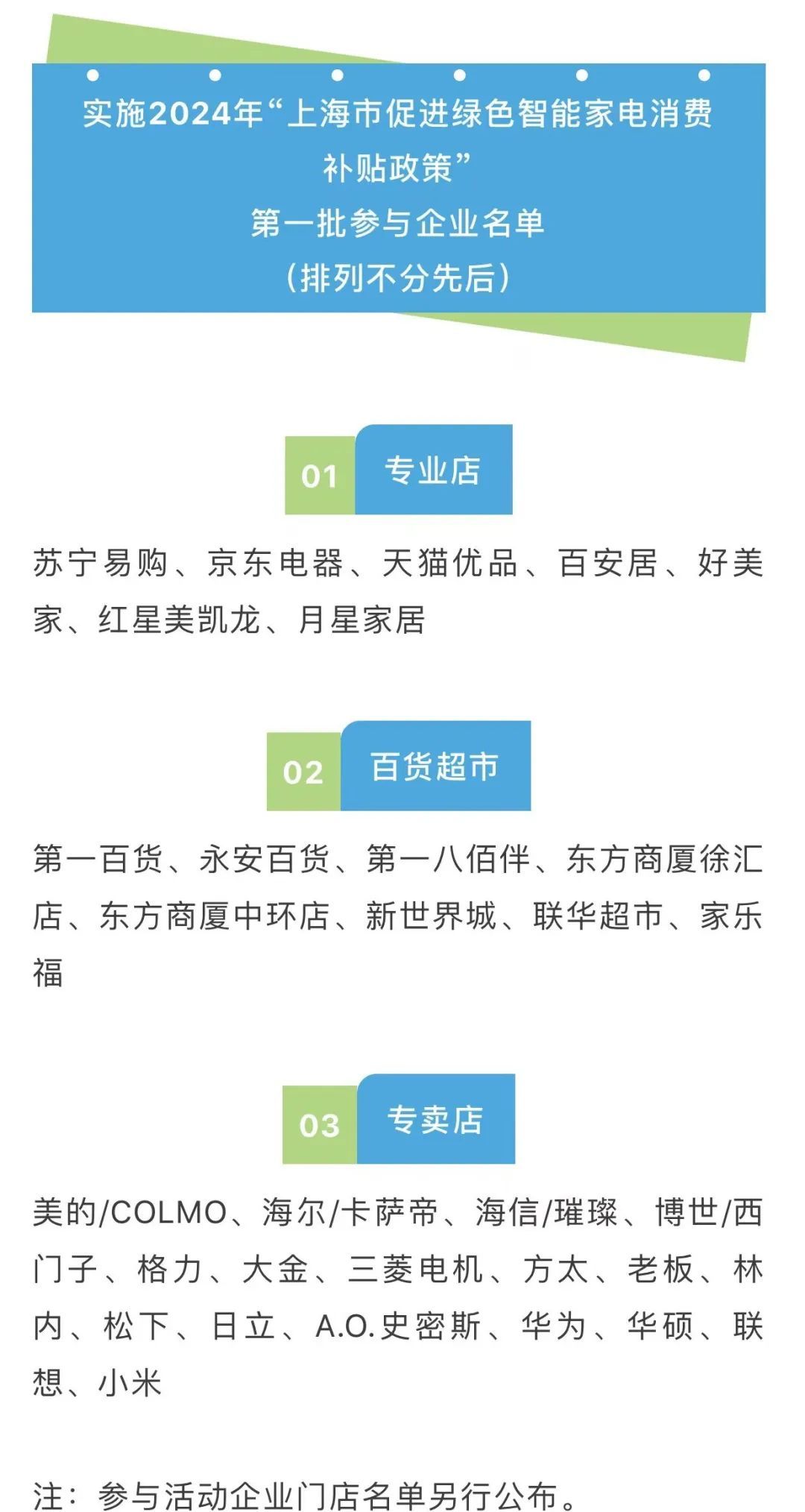 近日,市商务委在官网上公示2024年“上海市促进绿色智能家电消费补贴政策”服务机构和第一批参与企业的名单,市民能在苏宁易购、京东电器、天猫优品、新世界城、联华超市等多个线上平台和实体店购买绿色智能家电,享受专项补贴。