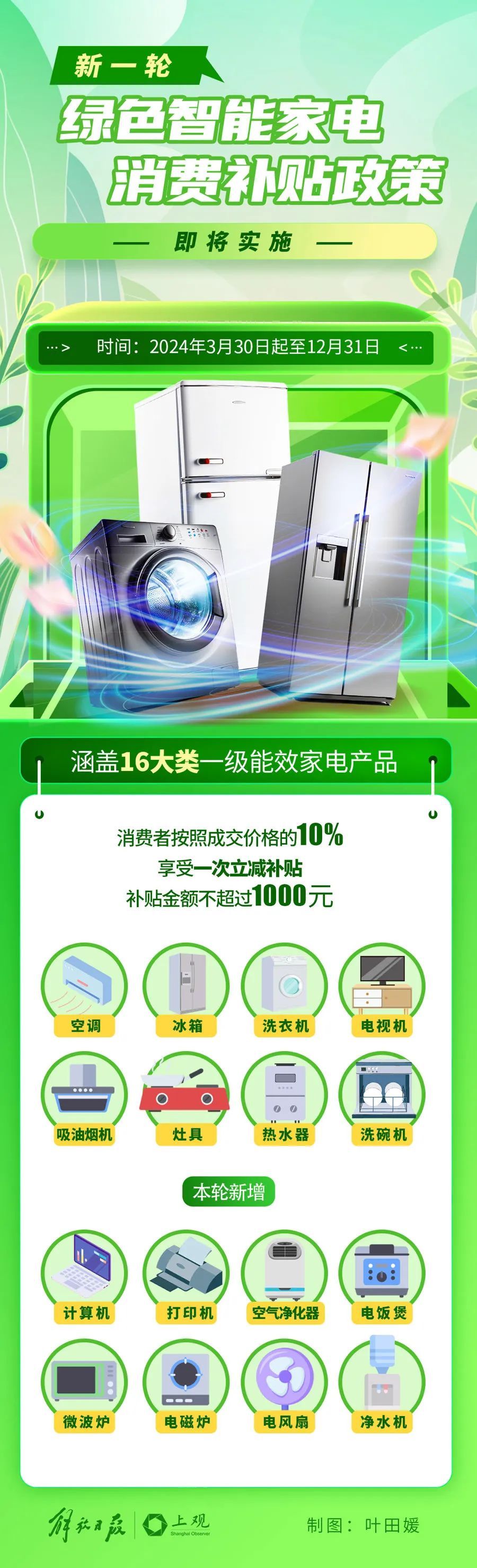 上海市新一轮绿色智能家电消费补贴政策内容为: