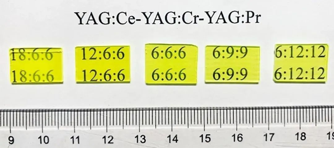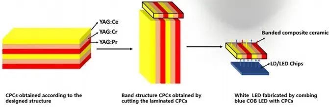 针对激光照明中现存的输出白光光色品质差的难题,研究团队设计了一种新颖的具有条形码结构的YAG:Ce/YAG:Cr/YAG:Pr荧光陶瓷,既解决了多掺杂离子荧光陶瓷中由于各离子之间能量转移导致的低光效的问题,又避免了复相陶瓷中不同层之间的再吸收或界面反应的问题,封装后得到了可调光电色性能的LED照明器件。与YAG:Ce荧光陶瓷相比,复相陶瓷在650~750 nm处有明显的红光发射。随着复合结构中YAG:Cr和YAG:Pr比值的增大,其发射光谱中的红色光谱成分显著增加,有利于白光LED显色性能的提升。当YAG:Ce/YAG:Cr/YAG:Pr的厚度比为6/6/6时,复相陶瓷在800 nm处的透过率达60%,流明效率为106 lm/W,Rf为86,CCT为7642 K,表现出良好的发光性能。相关研究成果发表在Journal of the American Ceramic Society(2024, 107: 1061-1069)。该论文第一作者为上海硅酸盐所毕业博士研究生刘欣,通讯作者为上海硅酸盐所李江研究员。