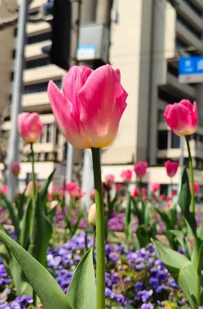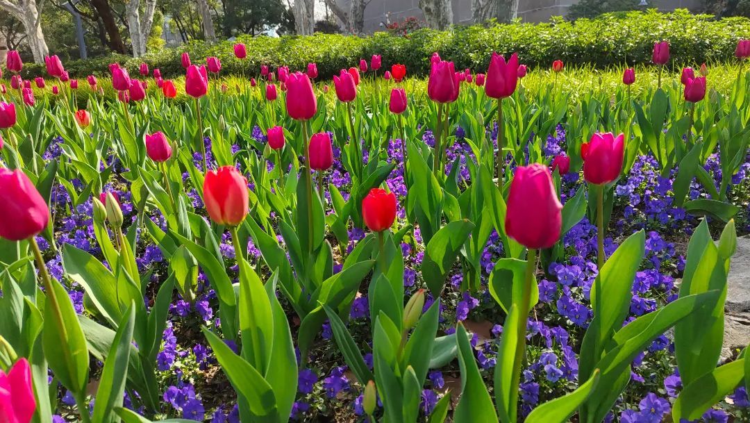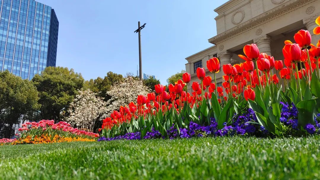 友谊会堂的南京西路花坛,洁白的玉兰和各色郁金香争奇斗艳,一片姹紫嫣红的景象。午休时间,在附近工作的上班族在这散步、赏花、拍照,很是惬意。