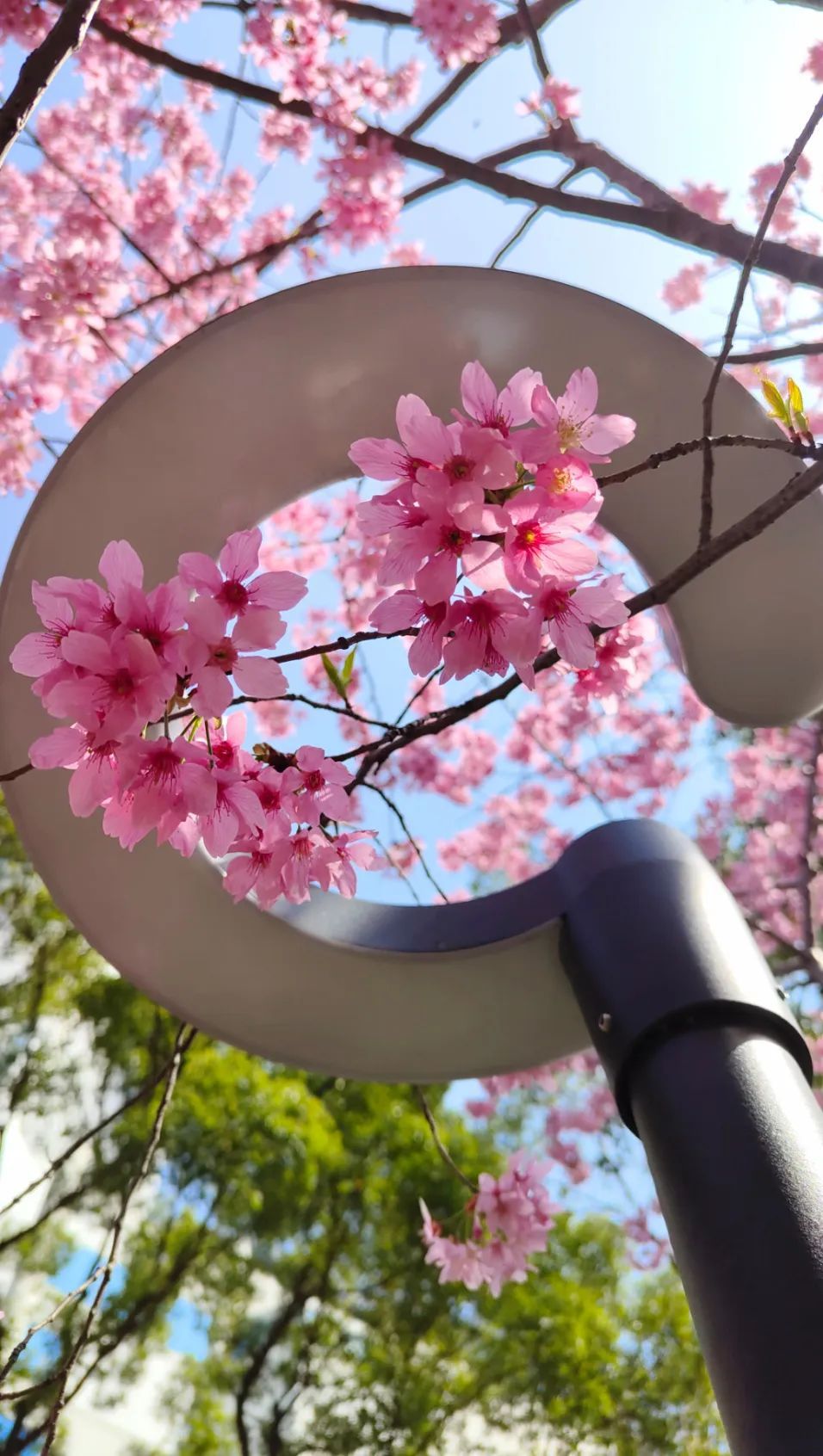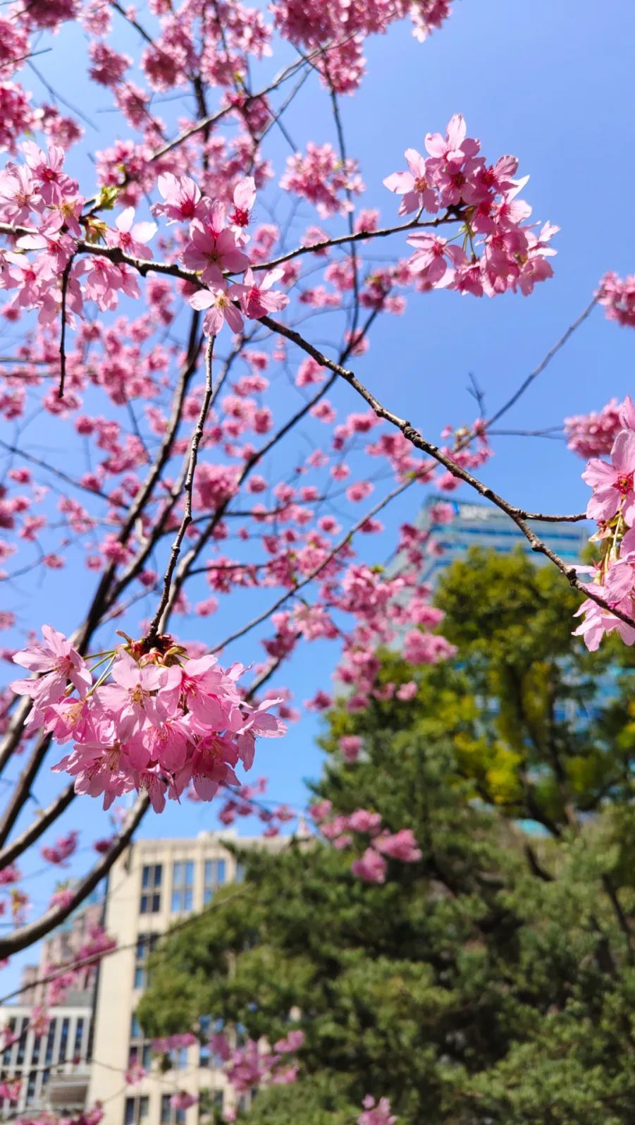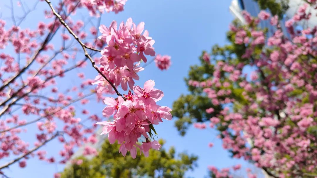几株红粉佳人樱热烈盛开,粉色的花朵在枝头迎风摇曳,灿若云霞,俨然一幅动人的春日美景图。
