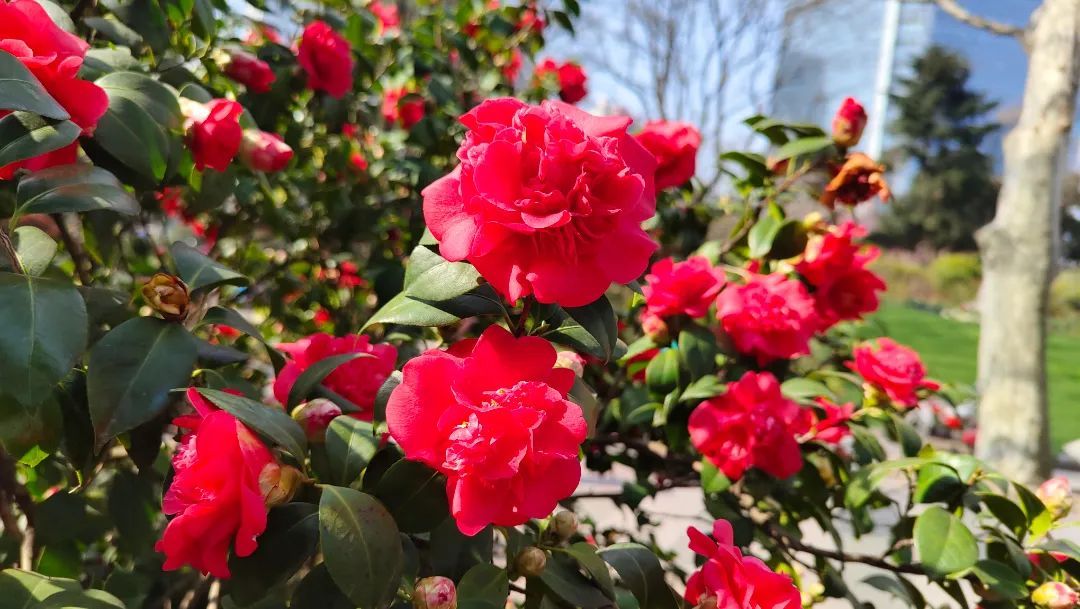 天气晴好,公园里春意盎然。一朵朵鲜红的山茶花,在阳光的照射下,显得分外娇艳动人。