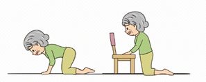 3.双手支撑地面,抬起臀部,弯曲膝关节,然后尽力使自己面向椅子跪立,双手扶住椅面。
