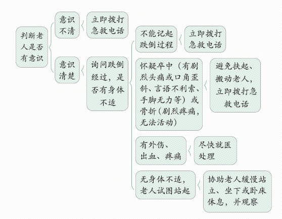 看到老年人跌倒后,不可急于扶起,要根据老年人的意识、受伤情况等区别处理。