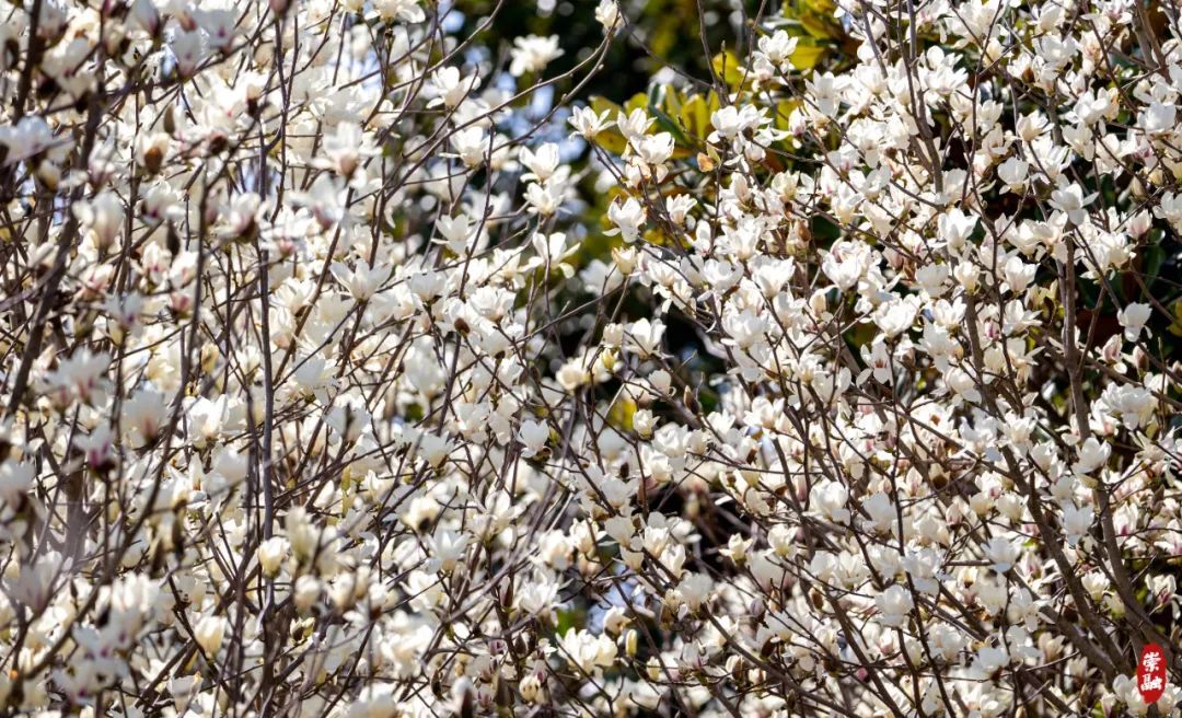 随处可见玉兰开满枝头、迎风招展,
