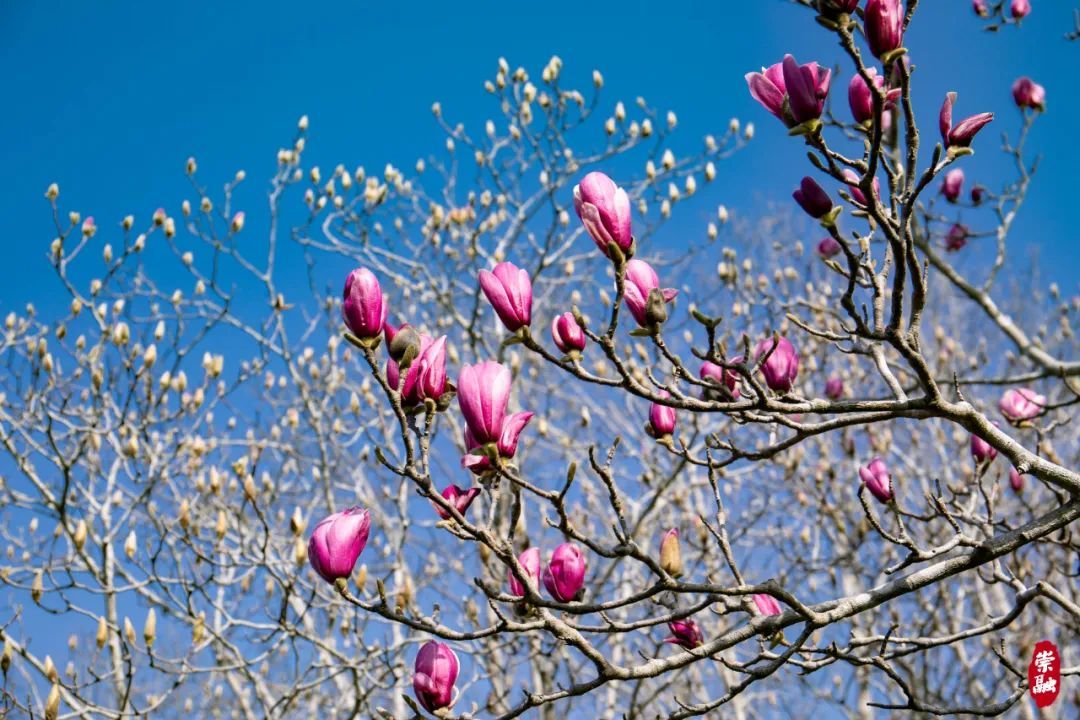 一旁的紫玉兰含苞待放,