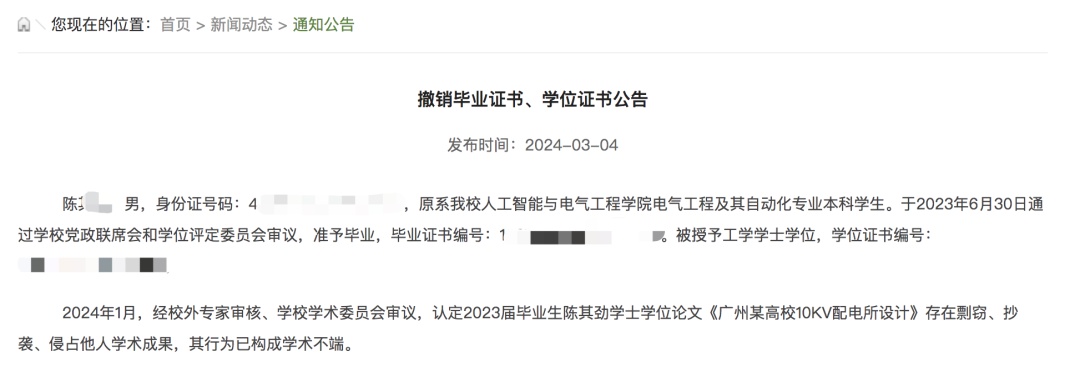 公告显示,陈某为人工智能与电气工程学院电气工程及其自动化专业,于2023年6月30日通过学校党政联席会和学位评定委员会审议,准予毕业,被授予工学学士学位。2024年1月,经校外专家审核、学校学术委员会审议,认定其学士学位论文《广州某高校10KV配电所设计》存在剽窃、抄袭、侵占他人学术成果,其行为已构成学术不端。
