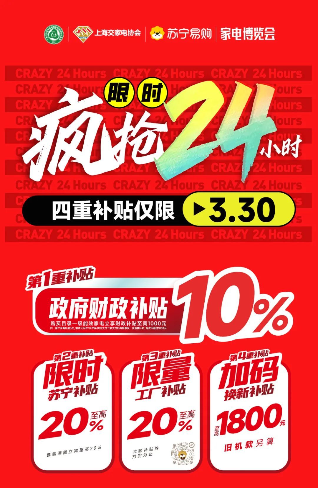 上海苏宁易购携手各方合作伙伴,将推出“330限时疯抢24小时”四重补贴活动,打造“2024家电博览会”,加码1亿元让利补贴。针对长宁区居民,苏宁易购中山公园店还特别推出洗衣机、冰箱、衣物、包袋的免费清洗和护理服务。 上海市新一轮绿色智能家电消费补贴政策将于2024年3月30日至12月31日开展,对16大类一级能效家电产品进行补贴。作为聚焦“为用户提供家庭场景解决方案”的零售服务商,上海苏宁易购多措并举,积极助力从消费端推动家电产业绿色升级。 “消费者不仅能在线上线下渠道买到各类新趋势电器及数码产品,还能享受实打实的优惠和便捷服务。”苏宁易购上海地区总经理何晓伟表示。 据悉,3月30日,苏宁易购将推出“330限时疯抢24小时”优惠活动。活动当日,消费者至线下门店购物,可享四重补贴,包括政府财政补贴、苏宁限时补贴至高20%、品牌限量补贴至高20%以及以旧换新加码补贴至高1800元。 “2024家电博览会”将持续至5月5日,其间苏宁易购将联合百大家电家装品牌,推出1亿元让利优惠,补贴力度更大、商品选择更多、服务体验更佳。 苏宁易购中山公园店店长赵洪福介绍,超百款绿色智能新品已在门店上新。例如,西门子超氧真空舱十字门冰箱,以真空零度环境延长保鲜时间,对比过往杀菌净味能力更为进阶,为消费者解锁智能储鲜全新体验。 海信A331春风二代空调,能实现“冬天新风不冷,夏天新风不热”的效果,双翼控风、随心调控风向、立体防直吹等功能,可更好满足老人、小孩、母婴人群的需要。 三星QN90 4K mini LED电视,依托先进的AI算法,可提升画质内容接近4K分辨率,可实现高端画质、高端音质的音画体验。 除了新品及优惠,苏宁易购中山公园店特别推出免费清洗服务。“现在人们生活水平逐渐提升,大家的健康意识都很强,越来越多家庭对家电清洗服务及衣物护理的需求与日俱增,这也是我们推出本次服务的契机。”苏宁易购中山公园店店长赵洪福表示,苏宁易购中山公园店免费清洗服务将持续至12月31日,长宁区居民可提前3天至门店咨询报名,或通过文末二维码扫码进入活动H5界面预约。 针对洗衣机、冰箱等家电商品,服务申请最快将在一周内通过。苏宁帮客工作人员将上门对冰箱内部进行深度清洗,去除冰箱内隐藏污垢。洗衣机大多分为滚筒洗衣机和波轮洗衣机,工作人员将使用清洗包清洗洗衣机内桶,去除外壁污渍和异味。 衣物和包袋的免费护理服务将在店内进行,皮草、羽绒服、呢绒大衣等衣物,皮包、帆布包等包袋均可,工作人员将使用干洗方式进行护理,使之表面纹理和形态保持良好。 苏宁易购中山公园店 地址 长宁路999号2楼 营业时间 周一至周五 10:00—22:00 周六、周日 9:30—22:00 苏宁易购中山公园店 免费清洗服务预约渠道