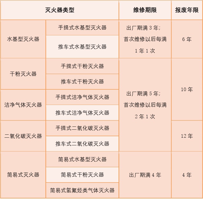 4.严格执行灭火器使用年限规定。根据灭火器填充灭火剂种类不同,灭火器瓶体使用年限也不同。通过灭火器瓶身钢印的生产年份,确认使用的灭火器是否到了维修报废年限,应严格执行不同种类灭火器的维修报废年限规定。