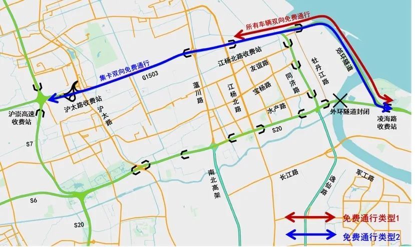 1.G1503江杨北路收费站-凌海路收费站双向对所有车辆实行不计费通行;