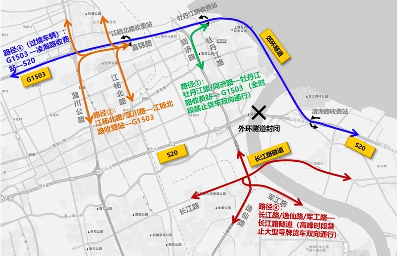 市公安局交警总队介绍,3月22日24时,上海S20外环隧道迎来了为期12个月的大修工程。随着S20外环隧道封闭施工的启动,G1503郊环隧道、长江路隧道成为主要越江绕行线路,隧道内车流量增长明显,通行压力大幅提升。明天是S20外环隧道施工启动后的首个周一早高峰,请大家适当提前出门,通过导航、广播等渠道及时获取路况信息,合理规划出行路线,文明守法,平安出行!