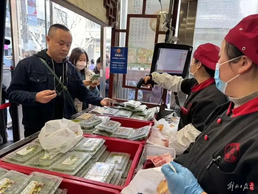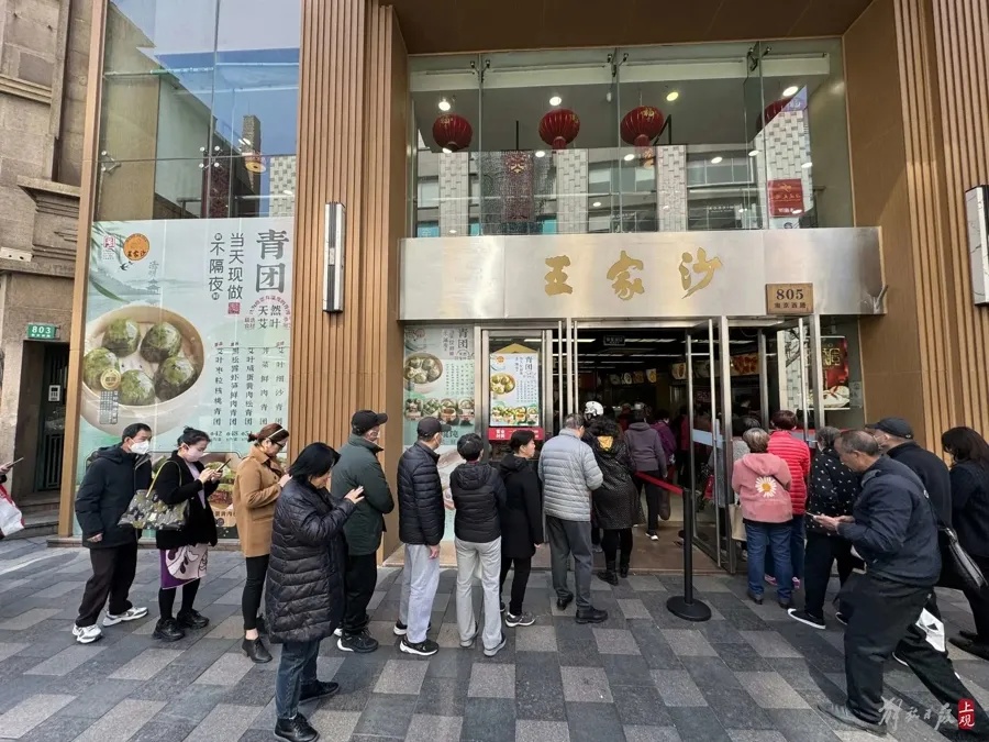 上海德兴馆的青团,坚守传统做法,个大皮薄、清香扑鼻。“豆沙,细腻清甜。咸蛋黄,又沙又润,肉松还带点嚼劲。青团的外皮吃起来清爽。”在附近上班的谢小姐打包了六个青团,要带回单位,请同事吃个中式下午茶。上海德兴馆非遗传承人张坚介绍,德兴馆的青团现制现售,保留传统的原汁原味,青团保质期都很短,“吃的就是个新鲜”。青团包制比较费人工,点心师傅每天早上5点不到就开始忙碌。和面、擀皮、拌馅……工序看似简单,但一道都不能马虎。“顾客早已熟悉了这里的老味道。”张坚说,有老顾客2月底就来问,什么时候开始卖青团了,盼着我们的青团早点上市。只要大家有需求,我们的青团就会“准时报到”,而且不涨价。当冒着热气的青团摆出来,两位老顾客马上让店员打包两只,捧起来就吃 。“青团本是冷食点心,但是这几年热腾腾的青团很受食客青睐。”张坚说,热的青团吃起来更糯、更有嚼劲,还有一股清香,而且皮子能“拉丝”,也不会轻易断开。目前,上海德兴馆复兴荟店、豫园店、中华路店、昌里路店各色口味青团都上市了,中华路店还额外供应黑松露菜肉青团。在人头攒动的豫园商城,各家老字号餐厅这几天也纷纷上线了青团。豆沙、咸蛋黄肉松、香干马兰头…… 无论消费者喜欢甜口还是咸口的青团,在这里都能得到满足,还有“榴莲控”必尝的榴莲青团。记者还发现了几款别处看不到的苏式青团。苏式青团的个头更小,小巧精致。来自苏州的老字号松鹤楼面馆今年推出了三款苏式青团:豆沙、芋泥以及炒肉馅。甜口的豆沙、芋泥口味清甜,带有回甘,更像一款清新的中式甜品。咸口的炒肉馅青团,这样的搭配有些出人意料,据说很受年轻消费者的欢迎。“第一次吃,感觉有点像鲜肉汤团,但它的味道更鲜,食材也很丰富。”白领王小姐现场品尝后说。豫园店店长介绍,炒肉馅青团的灵感来自苏州当地的传统名小吃——炒肉馅团子:在蒸熟的糯米、粳米粉团里包上炒熟的肉馅,再浇上卤汁。口感集软、糯、润、鲜于一体,馅大卤多,清鲜可口,受当地人的欢迎。松鹤楼面馆将炒肉馅团子和青团这两种传统美食结合在一起,制成了炒肉馅青团。馅心沿袭苏州本地的传统做法,把五花肉肉末、虾仁、扁尖、黄花菜、黑木耳等五种食材按比例搭配。先把食材切成大小均匀的丁状或末状,然后按各自的熟成顺序依次下锅煸炒,炒出香味后再加入高汤同煮。如此操作后,一锅色泽诱人、鲜香扑鼻的炒肉馅心就制作完成了。最后包入青团皮里,做成一颗颗圆滚滚、绿油油的炒肉馅青团,让上海消费者一口就能品尝到两种苏州的传统点心风味。热搜第一!上海一男子被流浪猫绊倒,投喂者被判赔24万...网友吵翻→