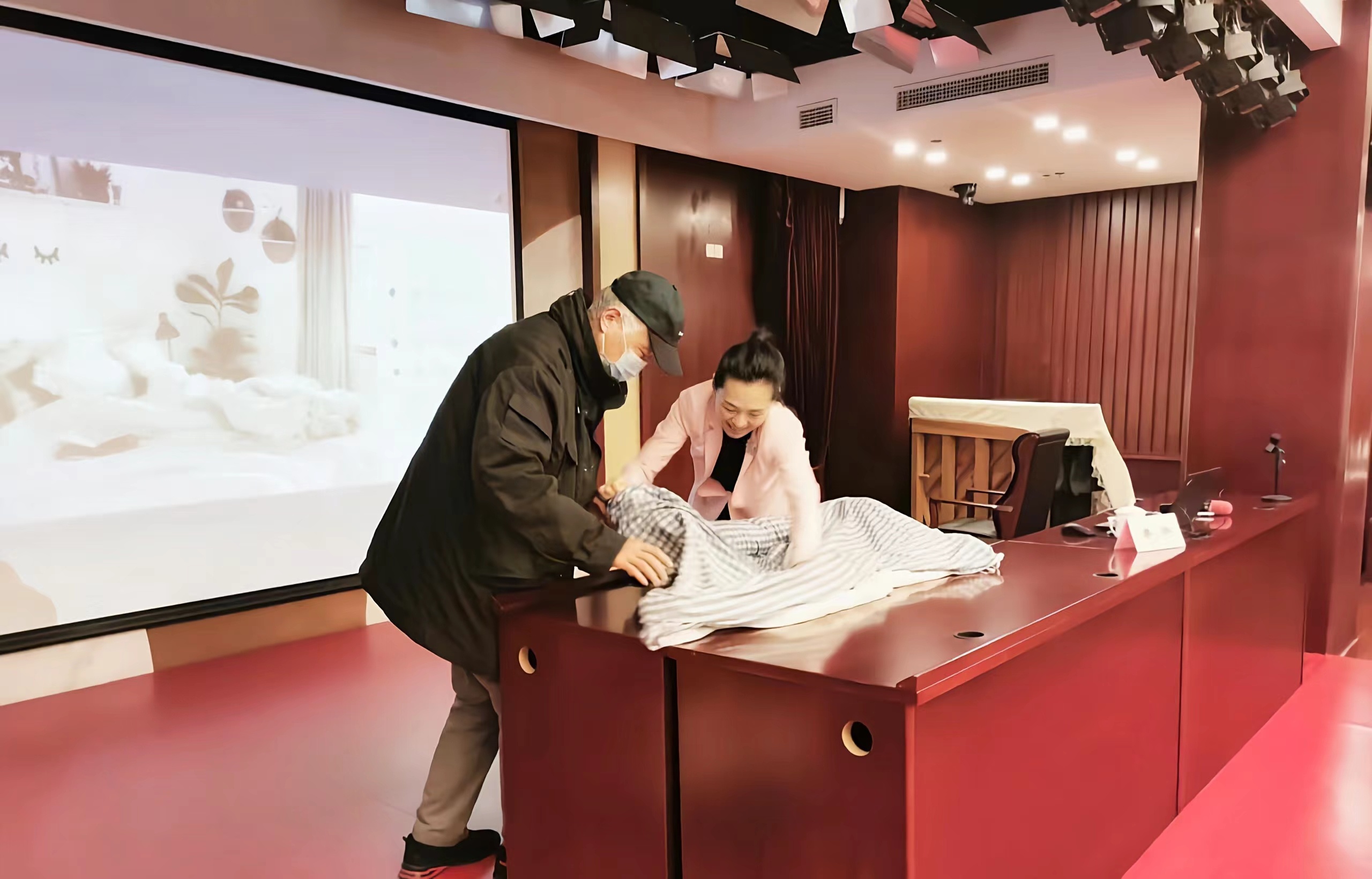 讲座现场,辜井老师运用床笠、被套、被子、上衣、裤子、袜子等日常物品,现场教授老同志动手操作日常衣物的折叠与收纳,帮助老同志掌握科学整理的小技巧,体验收纳的妙处。