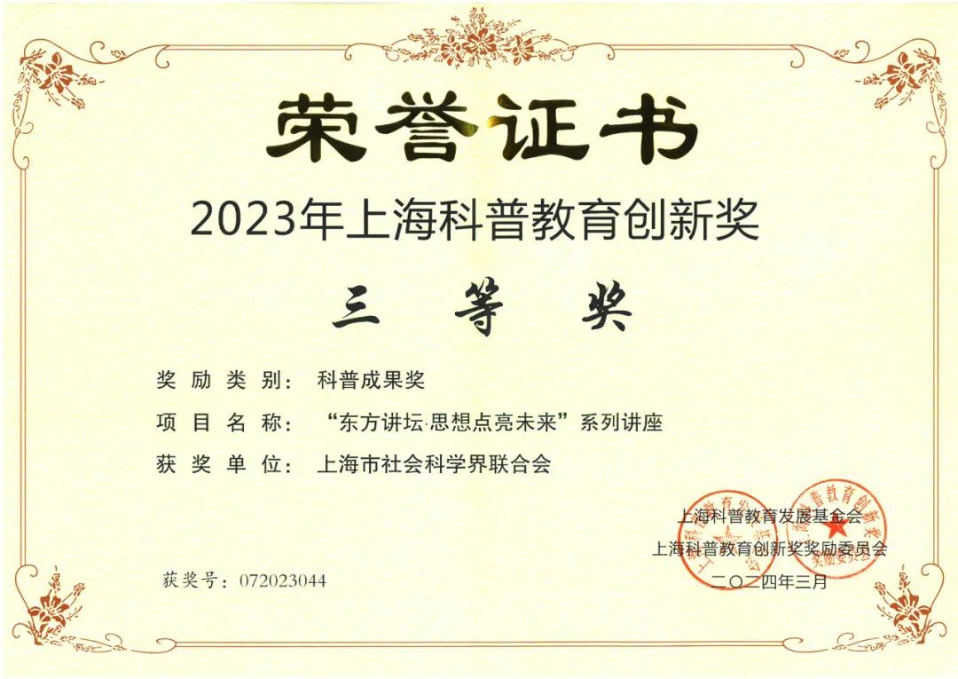 3月23日,第十二届上海科普教育创新奖颁奖典礼举行。市社联“东方讲坛·思想点亮未来”系列讲座项目获科普成果奖三等奖。