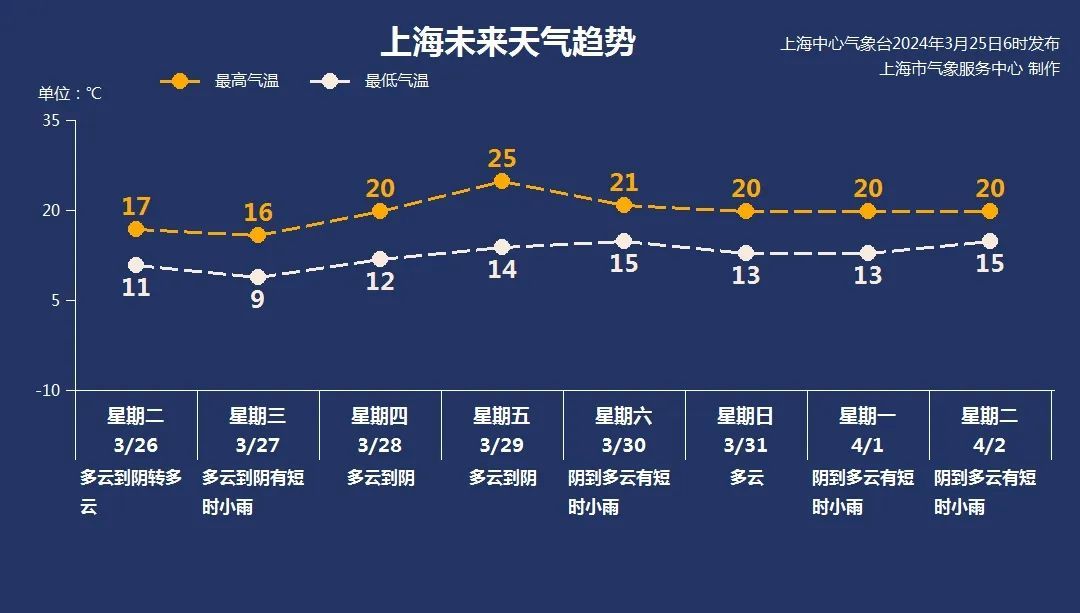上海市气象局首席服务官邬锐告诉记者:“明天为多云天气。本周天气总体来说没有明显的降雨,气温先降后升,周三和周六会有短时的阵雨天气,不过对大家出行没什么影响。”