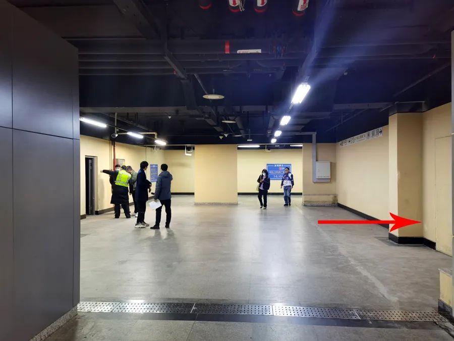 △上海火车站这一侧:旅客们抵达上海火车站后,沿着出站通道前往东北出站口时,一堵防火板筑成的白墙拦住了去路。白墙后方,就是铁路侧预留的直联通道。△在地铁三四号线上海火车站站这一侧:从7号、8号出入口进站过闸机后,前往站厅层通道的右手侧黄色墙面上,有一扇不起眼的对开门(图上箭头处)。门内,是地铁站的一处仓库。仓库的内侧墙体后方,就是预留通道。
