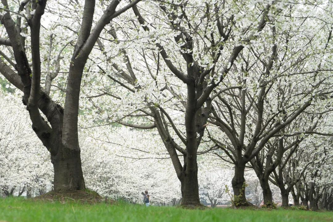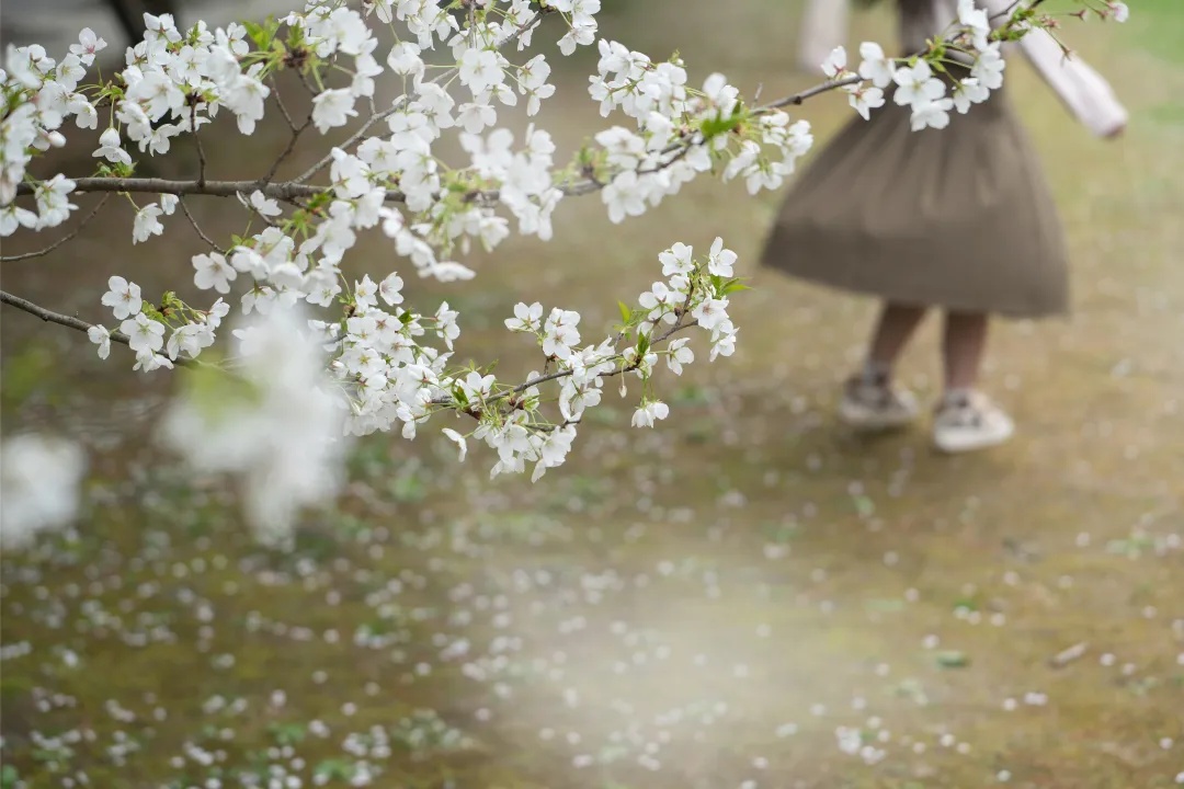 春风吹落纯白花瓣,下起场场樱花雨,嫩绿的草地便铺上一层淡色地毯。偶尔有三两只蜜蜂在花间穿梭,也为这片樱花海增添了几分灵动和生机。