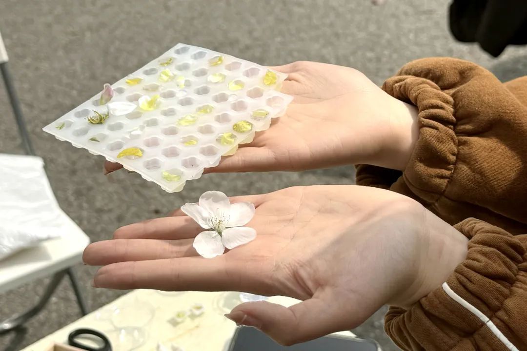 在樱花饰品手工制作摊位前,大家或轻拈一片花瓣,或是小心取下花蕊,用滴胶材料将烂漫的樱花制成一件件饰品,用这种方式留住春天。“刚刚在同学的指导下亲手制作了一件樱花手工品,等它彻底干透就可以做成小挂件随身携带,仿佛把一整个春天都带在身边。”机械学院大三学生李一晴说。