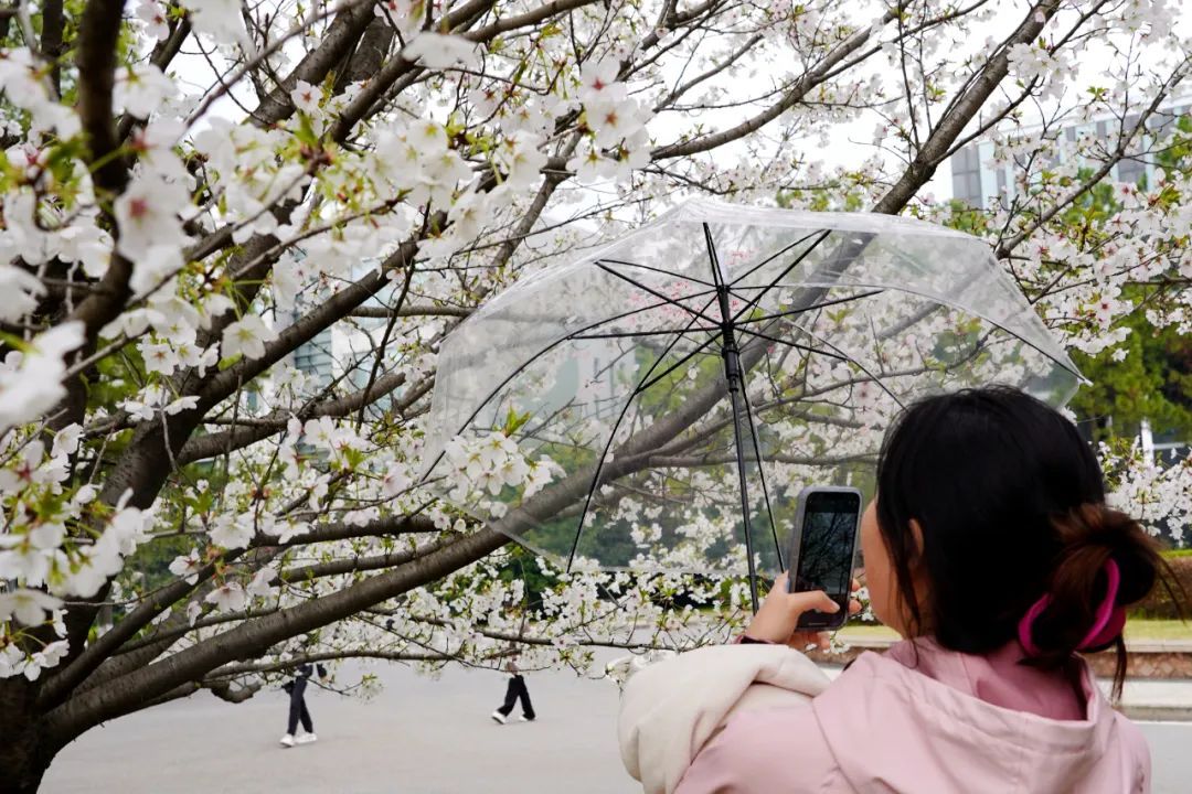 艺术与传媒学院的学生唐雨筠特地拿着一柄自己画的樱花伞来此拍照。“路过这片樱花林的时候,盛开的樱花给了我灵感,就在透明的伞面上绘制了几朵樱花。用这样的方式把我看到的樱花雨永远留下,感觉是很浪漫的一件事。”唐雨筠说。
