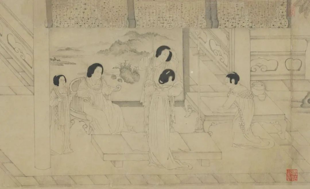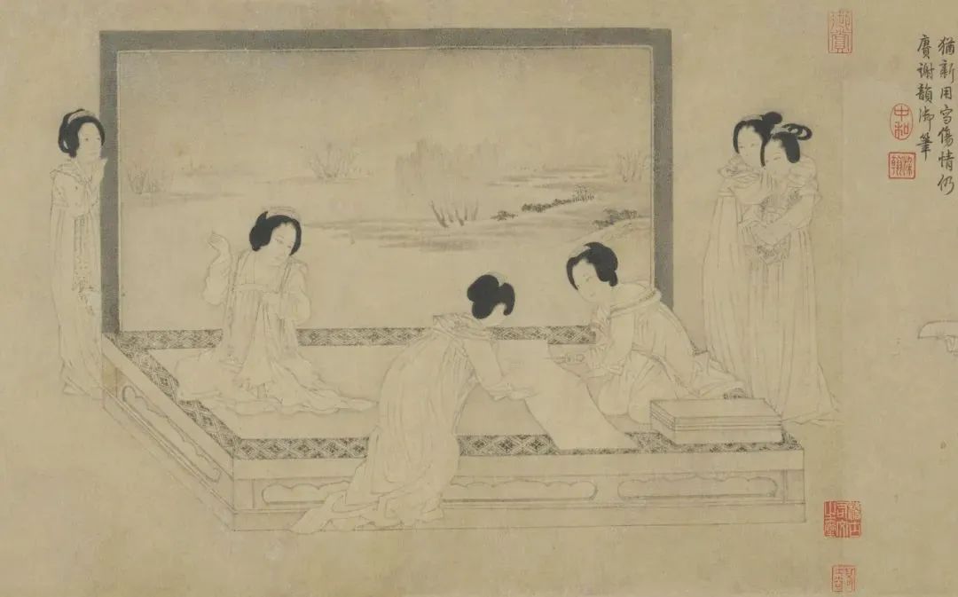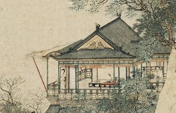 《楼阁远眺图》本身画面很有代表性地描绘了这个主题的闺怨内涵,借由楼阁上独立女性望向空白水景之形象,传达古典诗词中闺中妇女思念远行良人的哀怨情思。对这种情感的表达,在中国文学传统中早已形成典型,但却未曾在绘画上有积极的表现,最多仅有由擅长仕女画的画家针对“捣衣”“秋扇”等题材作了一些图画式的解读,例如南宋牟益据谢惠连诗而绘制的《捣衣图卷》(1240年,台北故宫博物院藏),但总是受限于诗意图的格局,未能独立成画。