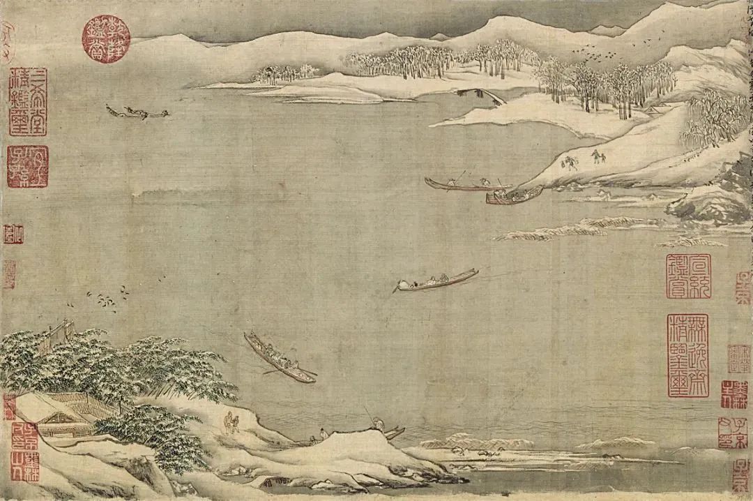 明 仇英 《临宋元六景》册之《冬日渡江》