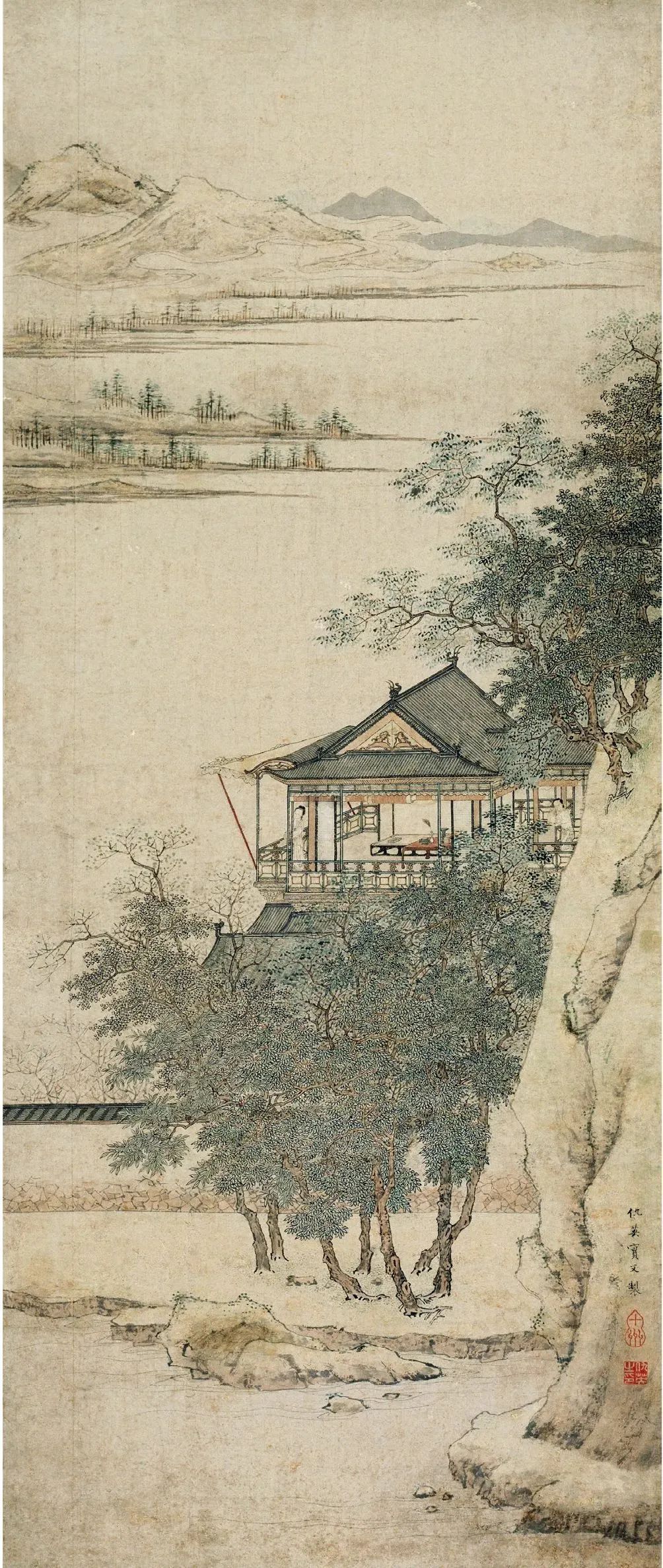 明 仇英 《楼阁远眺图》轴 纸本浅设色87.5 厘米 ×37.2 厘米美国波士顿美术馆